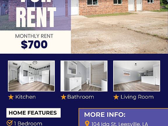 Cozy 1-Bedroom, 1-Bath Apartment for Rent in Leesville Welcome to this beautiful 1-bedroom, 1-bath apartment located in the heart of Leesville, LA! This cozy and modern space offers a fresh and comfortable living experience. Perfectly situated close to local schools, this apartment provides convenience for both students and families. Key Features: Spacious 1-Bedroom Layout with plenty of natural light Kitchen featuring sleek countertops and appliances Bathroom with contemporary fixtures In-house Washer/Dryer for laundry Water Utility included (not electricity) Convenient Location close to schools, shopping, and dining options Enjoy the quiet, neighborhood feel while being just minutes away from everything you need. Whether you're relaxing in your newly renovated space or stepping out to explore the area, this apartment offers the best of both worlds. Rent: $700 per month Deposit: $300 Available Now Schedule a showing today!