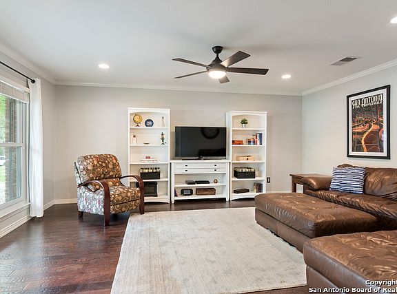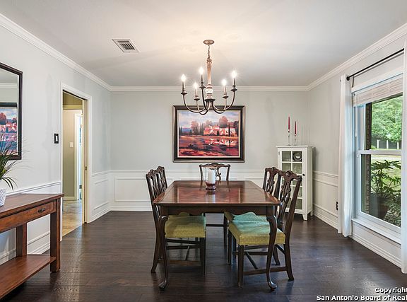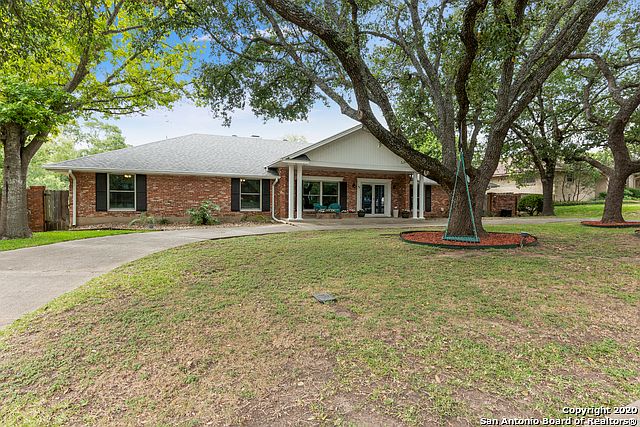 Stunning red brick traditional home with mature trees on a nearly 1/2 acre lot located in the highly desirable Castle Hills Estates neighborhood. 5 bedrooms, 3.5 baths. Hardwood floors throughout. Full bar with wine/beer fridge that conveys and beautiful glass cabinetry. Updated kitchen with granite countertops and tile floor. 5th bedroom is an office or study. Separate formal dining with custom wood work. Bedrooms include large walk-in closets. Large master suite with fully updated master bath with double vanities, standing glass shower and walk-in closet with built-in shelves. Oversized laundry/utility room leads to breeze-way to garage. Rear access with automatic gates. Amazing pool with water feature and spacious backyard with newly remodeled patio - perfect for entertaining!