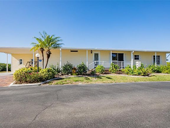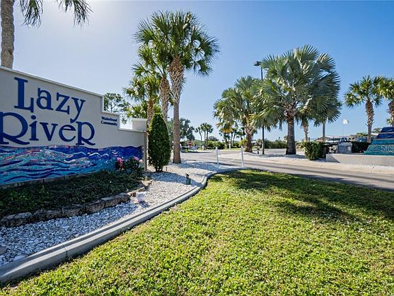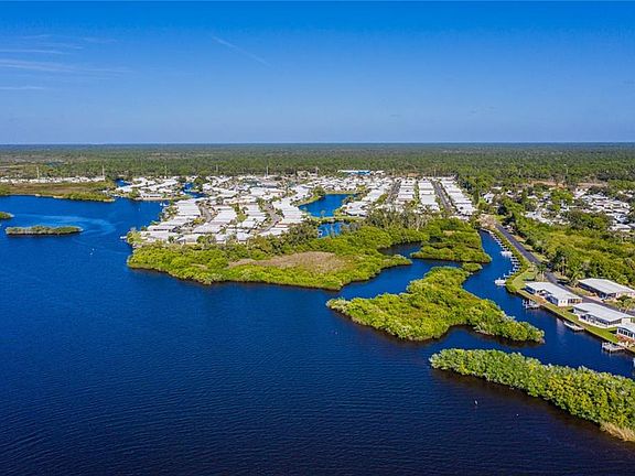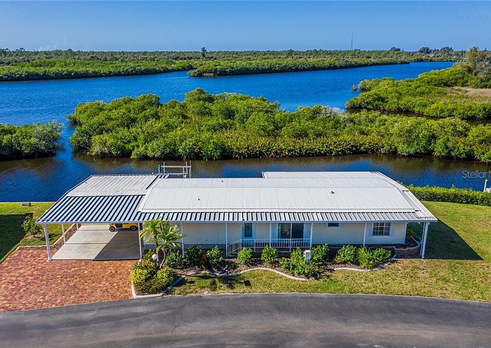 Welcome to Lazy River Village. This unique property of Lazy River Village has approximately 100 feet of sea-walled waterfront with boat lift. The home is positioned for privacy more so than any other home in the park. Plywood floors, per owner. Over 1350+ square feet of living space. Sitting on your back lanai with your favorite beverage in the morning or evening is going to truly make you feel you are living in PARADISE. The paver driveway has extra parking. The home has a very large storage shed. Nestled along the Myakka River this 55+ community is a true Southwest Florida gem. If you are looking for an active friendly park, look no more. Pontoon boating is a park favorite. Pickle ball is pretty darn competitive! The magnificent clubhouse has recently been updated. The amenities are plentiful. Lazy River Village even has a professional wood shop! Make an appointment today to visit! Don't miss clicking and viewing the **Inside 3D tour and Aerial tour** attachments.