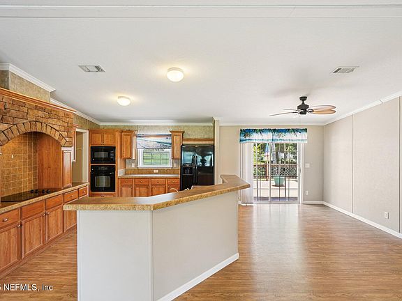 Set on an expansive lot with a generous front yard and a tucked-away location, this home offers peaceful surroundings and thoughtful indoor-outdoor living. Step onto the pavered patio and open front porch before entering a spacious open floor plan with vaulted ceilings that create an airy feel throughout the main living area. The kitchen stands out with abundant counter space, a drop-in stove top framed by a stone-wrapped vent, and ample cabinetry for storage. A breakfast bar connects the kitchen to the dining space, where natural light streams in from the sliding glass doors that open to the oversized back deck. The primary bedroom offers plenty of space, along with a walk-in closet and a private ensuite that features a dual-sink vanity, soaking tub, and separate shower. Down the hall, two additional bedrooms include large closets and are joined by a full bathroom, a built-in office nook, and a bookshelf. A covered deck off the laundry room leads to an insulated utility shed for added flexibility. Residents may enjoy access to a voluntary association boat ramp and dock, with Dunns Creek Conservation and the St. Johns River just moments away.