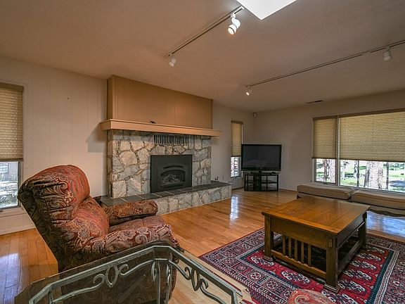 This centrally located, one level home has over 1900 sq ft living space PLUS an over-sized 2 car garage. Glass double entry doors with built in shades and large windows throughout provide lots of natural light. Large living room with blue stone fireplace and true hardwood floors. High end, stainless appliances in kitchen include a Dacor gas stove and Subzero refrigerator. Custom hardwood cabinetry with pullouts and solid surface counters in kitchen & both baths. Wonderful sunroom provides an additional living, dining space or study. Watch the deer and elk rest and play in your backyard. The home features a Mansard roof, also known as a French roof and was replaced 5 years ago.