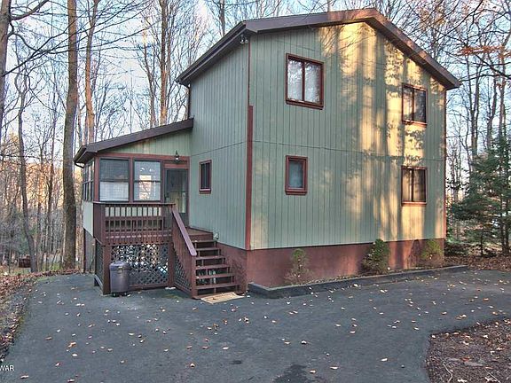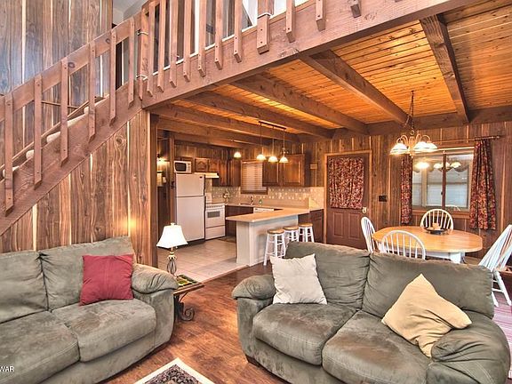 Conveniently located near the main entrance and within walking distance to the tennis/basketball/ball fields in a four season amenity filled community in the Northern Poconos. This 4 bedroom, 2.5 bathroom chalet home comes furnished and features a great room with cathedral ceilings a brick fireplace, a loft above and knotty pine ceilings in the kitchen and dining areas, new flooring on the main level. There's access to the rear deck from the sliders and the beautiful sunroom. The walk out lower level features a large family room. The amenities include lakes, beaches, pools, clubhouse with restaurant and pub, golf course, ski hill, tennis, indoor recreation complex with tennis/fitness center/arcade and more, basketball courts, ball fields, children's playground, miniature golf,