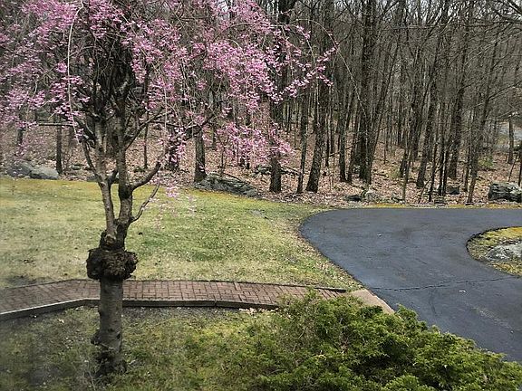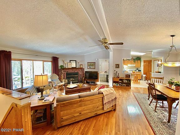 Beautiful 2,400 sq. ft. Home sited on gently sloping acre plus lot. You have the view but also privacy. This beautiful landscaping prepares you for the lovely open-concept, living room, dining, kitchen. Gleaming hardwood floors in pristine condition warm the space. Kitchen has large skylight with automated built-in-shade. Living room features corner brick fireplace and oversized picture window overlooking landscaped yard. Dining room has sliding glass doors to large deck. Bedrooms are setup in split location format, with master bedroom with a view and private bath on one side. On other side 2 additional bedrooms plus second bath. Lower level offers more space for the family room with woodstove, big laundry room, plus big extra room for you to use for office, library, etc. Fami