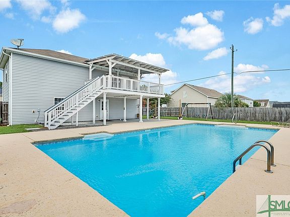 Located in close-knit Laurel Mills community, this out of the ordinary home features a wide open floor plan with durable vinyl plank flooring throughout, a dining room with judge paneling & renovated kitchen with granite counters, breakfast bar, wood cabinetry & all stainless steel appliances that convey with the sale. The large third-acre lot and beautiful Oasis at the rear of the home features a sparkling 30’ by 44’ in-ground salt water pool and spectacular double-decker porch overlooking the fully fenced rear yard. There is even a 12’ by 24’ shed with electric, perfect for storage or a workshop. Upstairs is a large primary bedroom with two closets, an ensuite bath, new dual vanities, a soaking tub/shower combo and access to the rear covered porch. Two additional bedrooms and a second bath are off the hall and a large bedroom with a huge closet can also act as a bonus room. Easy commute to Rincon, Pooler and Savannah, great schools too - Marlow elementary & South Effingham!