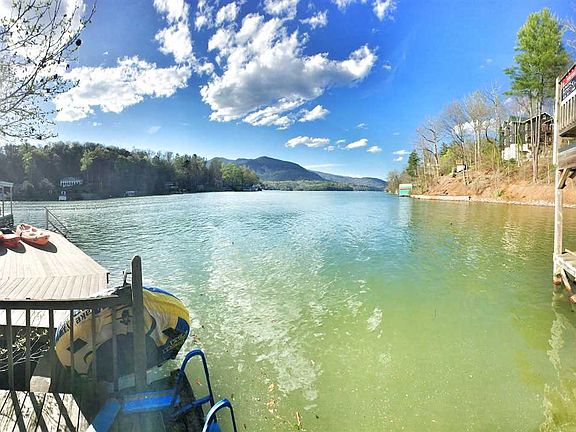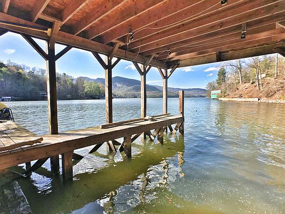 INCREDIBLE value on Lake Lure LAKEFRONT home (Assessed value = $506,000). Built in 99', home has 2 beds & 1.5 baths on 2nd Level + LOFT. On Main is a full bath, formal dining area, breakfast nook open to kitchen w/loads of cabinetry. Easy access & parking at street level + 1 car garage in partial basement. One of the most AWESOME views of the center of Lake Lure & the Rumbling Bald Mountains from Rooftop Deck of the 1 bay boat-dock in private cove which is the most Stunning aspect of property!