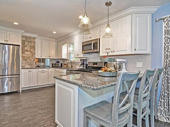 Beautiful completely updated four bedroom Colonial, featuring a brand new eat in kitchen with custom cabinets and granite counters, a stone accent wall and updated appliances. The 1st floor boasts a spacious living room with gorgeous hardwood flooring, mudroom, half-bath, and bedroom/office. Stunning tile runs throughout kitchen and office/bedroom. A sliding glass door takes you out to a large composite deck overlooking a beautifully landscaped backyard with paver patio, stonewall and fire pit. Perfect for entertaining! All outdoor space is connected by paver walkways and has a custom paver driveway. Beautiful flower beds surround the home and patio. Large master bedroom with his and her closets, one of which is a walk-in closet and two other bedrooms with hardwood flooring throughout. The full bath upstairs is newly updated and has an over-sized full tile shower and claw foot tub. Many updates including roof and windows. Centrally located, right in the heart of town. A must see!