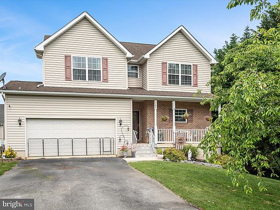 Inviting 4 bedroom 2 full bath Colonial home with a covered front porch, perfect for relaxing! Located on a no-thru street, this home features a main floor primary suite with a walk-in closet and full bath, plus three additional bedrooms and a full bath upstairs. The cozy living room offers a fireplace (sold as-is) and a cathedral ceiling. Enjoy a spacious kitchen with a separate dining area and main-level laundry. The walk-out basement is unfinished and ready for your personal touch. Additional highlights include an oversized garage and a rear deck for outdoor enjoyment. Conveniently located near I-81 and just minutes from the hospital.
