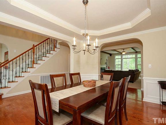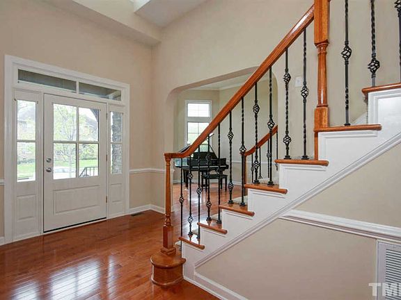 Executive Brick/Stone front home w/Rocking Chair porch in great Cary location! Grand entry w/wrought iron staircase. 1st Floor Master Suite. Formal Living Room w/front turret. Elegant Dining Room w/box molding. Large Family Room w/beautiful custom beams. Eat in Kitchen leads to Sunroom/Study. Computer Room off of Kitchen. Additional well sized bdrms on 2nd floor. Back stairs lead to Loft & Media Room w/wet bar. Private backyard. Pool Community & Greenway trails. YMCA,Bond Park,shops,highway minutes away.