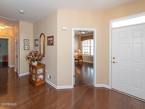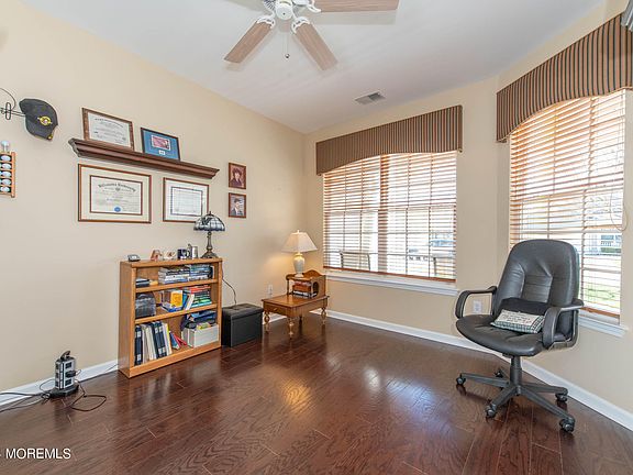 Welcome to this beautiful Inverness model in Four Seasons at South Knolls! Paver walkway leads to front porch. Spacious foyer leads to different areas in the house. First is the office with wood floors, then the laundry room, a full bath and the second bedroom. Towards the back of the house see the oversized dining room ready to entertain friends and family. Great kitchen with bar height counter and roomy dining area overlooks the family room with fireplace and built in cabinetry. Primary bedroom has 2 large closets and ensuite with jetted tub, separate shower stall and dual sink vanity. Gorgeous wood floors throughout most of house. French door in Family room leads to beautiful paver patio with power awning which backs to woods for privacy. Great storage room above the 2 car garage.