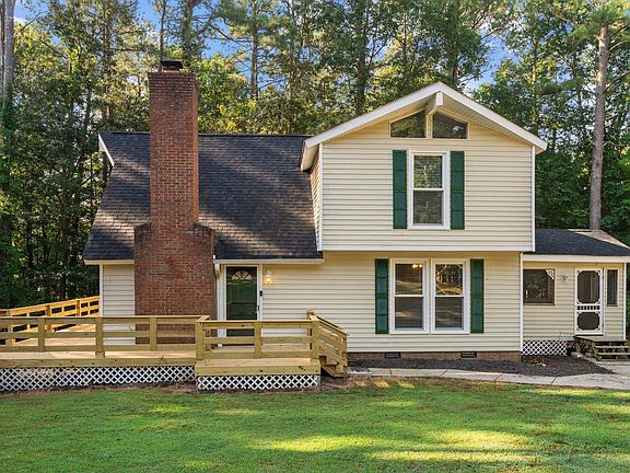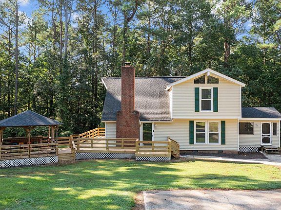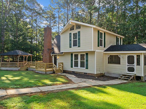 Unique Lake Home on Extra Lg Lot in Cul-de-sac, over an acre in Gated Community! One bedroom on 1st flr, 2 bedrooms upstairs w/ soaring ceilings and a huge loft w/ closet. This home has great outdoor space - screen porch, wrap around deck connected to a gazebo w/ tiki bar! Oversized garage, circular drive. New flooring, Heat pump, deck & windows all installed this yr, 2023! New roof was put on in 2021. Lake Royale is a private community with security and has tons of recreational activities which include, 2 beach areas w/ clubhouse & pavilion, Community swimming pool, outdoor fitness park, swimming, boating, fishing, tennis, basketball, volleyball, miniature golf, horseshoes and more.