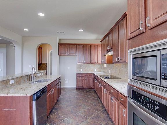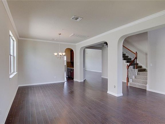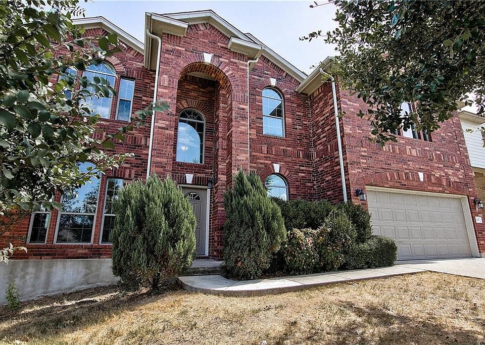 This Liberty Hill two-story home offers granite kitchen countertops, a loft, an office, and a two-car garage.