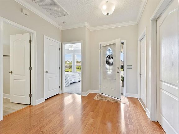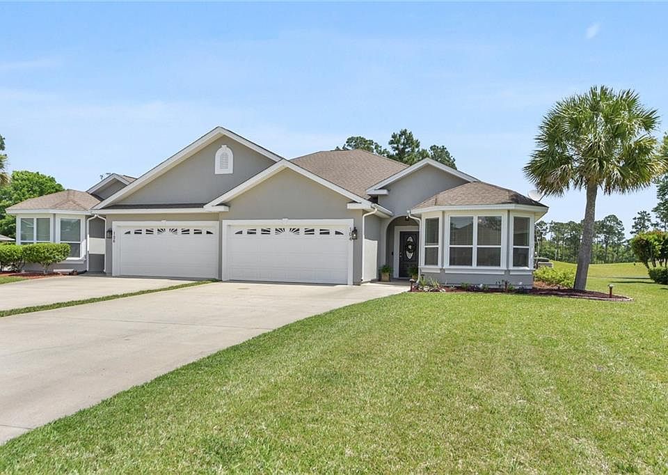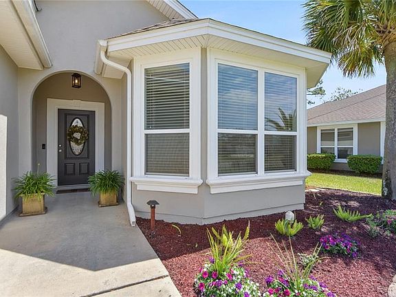 Perfectly landscaped& painted 3/2 w/natural wood floors in foyer, living room, den, kitchen, topped w/crown molding.Kitchen has shining stainless appliances, granite counters, under cabinet lighting, spacious pantry w/automatic light, breakfast bar,opening from kitchen to the den. Recessed lights in LR, KIT, den& owner's BR. Tray ceiling in owner's bedroom& living room. Also: water softener, interior LDRY w/washer/dryer, USB port outlets, 2" faux wood blinds thruout, full attic over garage. Owner's suite:private access to screened porch, ensuite w/double vanity, under cabinet lights, jet tub, separate tile shower, huge walk-in closet. Front bedroom has beautiful bay window, 2nd bedroom has tall vaulted ceiling w/accent light in alcove above closet. Views of the 17th green from front door through large picture windows in DR &den.Watch golfers pass by while on screen porch. Convenient to NSB KingsBay, apx 30 minutes to Jacksonville FL. Community pool, fitness, playground,park & lawn care