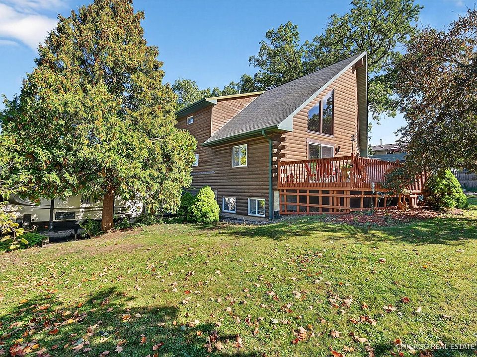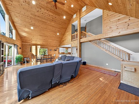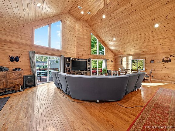 Welcome to this stunning log home in the serene town of Lakemoor, IL. With a unique aesthetic and beautiful finishes, this home is sure to impress. As you approach the house, the inviting front porch and wooden exterior beckon you inside. Once entered, the open living area will take your breath away with its soaring ceilings, perfect for enjoying cozy evenings with family and friends. The main level offers a bedroom with a full bath and large closets, as well. The gourmet kitchen boasts granite countertops, stainless steel appliances, and a large island that is perfect for entertaining. The dining area completes this space, offering picturesque views of the wooded surroundings. The walkout lower level is full of surprises, offering an additional bedroom and full bath, along with a large family room/ game room area. Step outside to the expansive patio, which offers plenty of space to host summer barbecues and enjoy nature. Located in a quiet community, this home is a peaceful retreat from the hustle and bustle of everyday life. Experience the modern amenities while enjoying the rustic charm of a log home. Don't miss your chance to see this one-of-a-kind property!