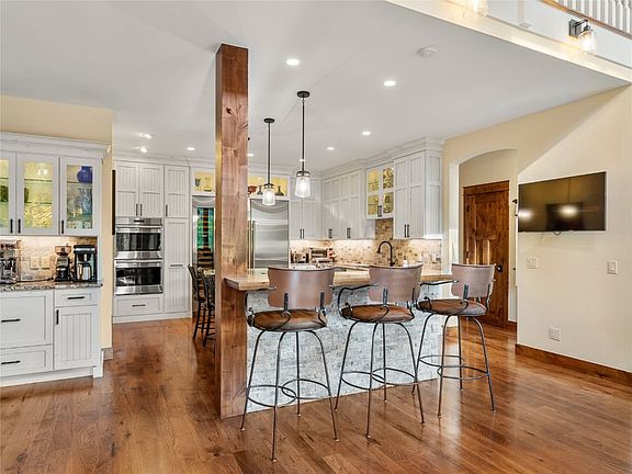 Warm wood accents and hardwood floors flow through a cozy-yet-expansive layout with four fireplaces. A striking multi-level staircase with custom balusters adds character. The main level centers on a chef’s kitchen with Wolf 6-burner + griddle, Sub-Zero refrigerator and wine column, two dishwashers, double ovens, and a large island with seating for seven. A dedicated coffee/wine bar streamlines hosting. Adjacent are the dining area, media room, powder room, mudroom with laundry, and a guest suite with patio access.