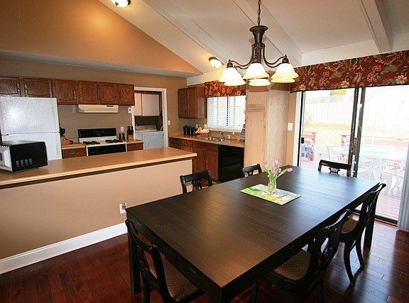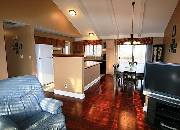 Great open floor plan ranch with vaulted ceilings and beautiful wood floors! One level living at its best with three bedrooms, laundry/utility room, and great room all on one floor! Sliders to large deck overlooking big yard with storage shed. Nicely landscaped with mature trees & on a hill with sunset views! Pull-down stairs for attic storage, attached garage with door to back yard. Don't miss out on this one!