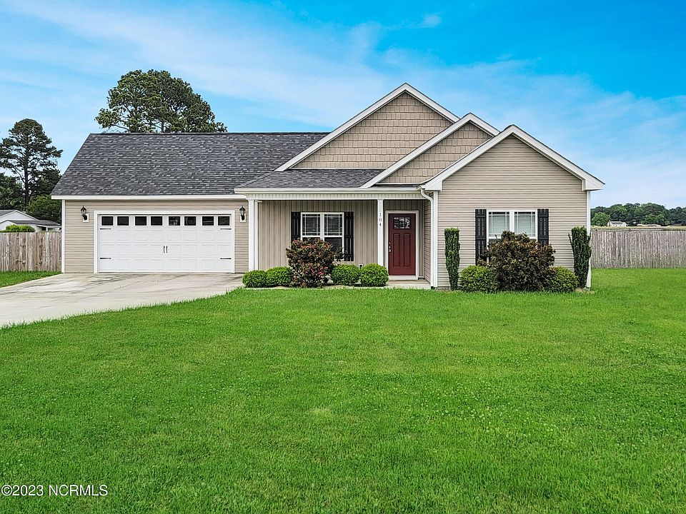 NORTH LANDING - Highly sought after neighborhood located about 7 miles to town and to Seymour Johnson AFB. Offers split floor plan with large family room and corner gas fireplace and vaulted ceiling. Just off the family room is a spacious kitchen with white cabinetry with soft close drawers, granite counter tops, breakfast bar, stainless appliances including refrigerator, a pantry closet, built in trash can drawer, etc. The kitchen overlooks a sunny breakfast room with a sliding door out to the rear yard enclosed with privacy fencing. The Master Suite has a walk-in closet, storage closet, and a large master bath complete with double sink vanities, a large soaking tub, and a separate shower. Situated on a .67 acre lot in the CB Aycock School District. Rear patio and a two-car garage. This is truly a MUST SEE HOME.