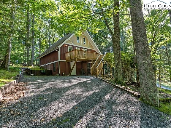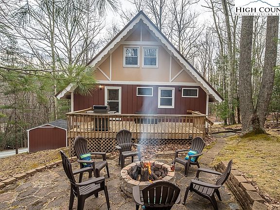 This perfect Beech Mtn ski chalet is centrally located near the slopes, golf course, and the Buckeye Rec center, and easily accessible, being only a few hundred feet of the paved road. The home sits on a beautiful lot with a gentle back yard, complete with a large stove paver firepit and gathering space. Along with a recent complete renovation and reconfigured stairs to lower level and upper loft, it has been nicely updated and features vaulted t&g ceilings and large windows and stone fireplace, and plenty of deck space on both sides. The main level features a king size master suite, another full bath for guests using the loft, an updated kitchen with granite and stainless appliances, and a large dining room that opens to the private back deck with grilling area and firepit lounge (perfect for entertaining!). The lower level features laundry, a queen size bedroom, a bedroom with 2 bunks to sleep 4, and another den/game area and access to the parking below. This mountain home comes fully furnished and turnkey, with a large storage building for a very good price!