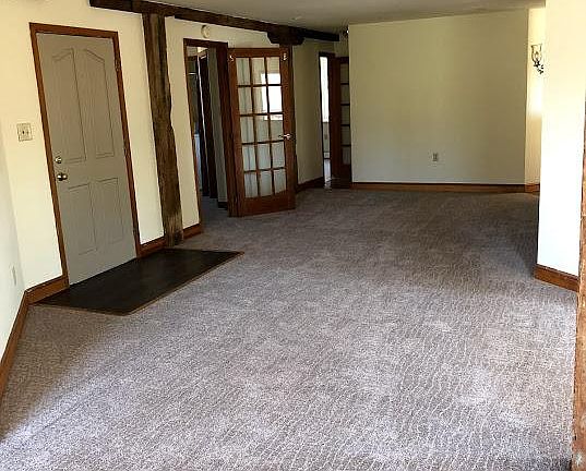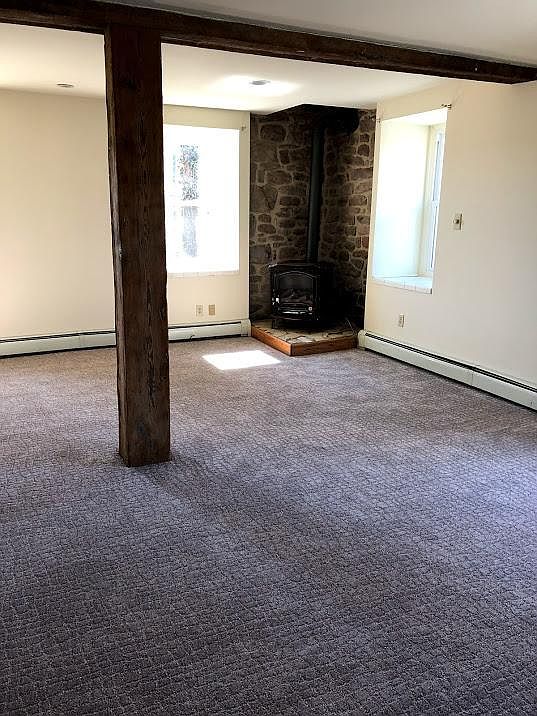 First floor apartment in an old grist mill! Open floor plan, exposed beams and stone throughout. Washer and dryer in unit. Use of yard and off-street parking. Brand new carpet and new windows just installed. Master bedroom is open to sitting area and kitchen. Owner pays trash/sewer/cold water