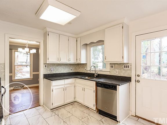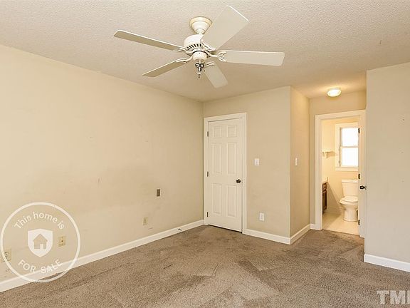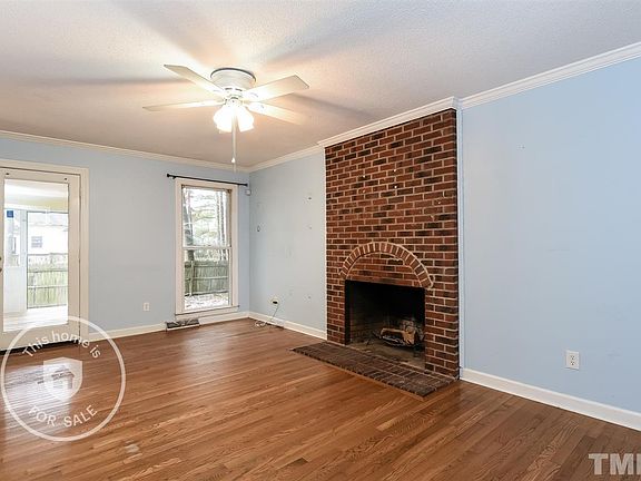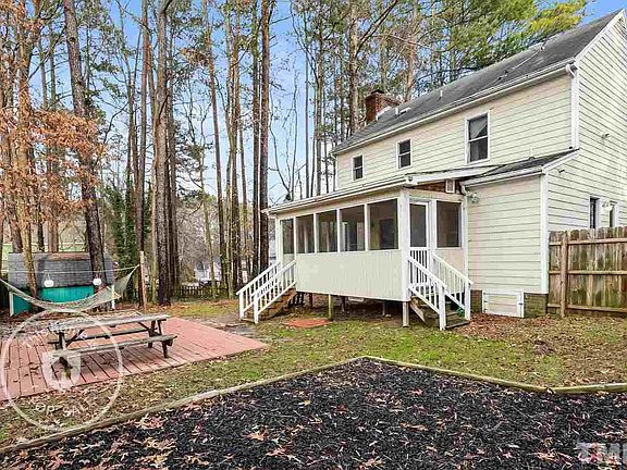 This Knightdale two-story cul-de-sac lot home offers a fireplace, stainless steel appliances, a den, an enclosed deck, and a backyard storage shed.