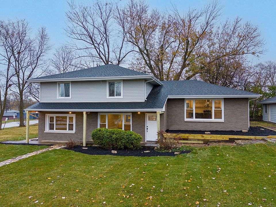 Step inside and be amazed by this MASSIVE two-story show stopper with five bedrooms and two bathrooms. Located on a desirable corner lot, this home has been completely remodeled in 2022 from top to bottom. The exterior features include a brand new roof, gutters, fascia, windows, and skylights for natural light. Every functional component of this home is brand new including: HVAC, electrical, plumbing, and hot water tank + softener. This home includes a wide open main floor plan as well as a grand family room with gleaming hardwood floors throughout. Four large bedrooms on the top floor and a stunning spacious second floor bathroom with a Jack and Jill sink. This home also has a first floor master suite, which is carpeted for comfort with a big walk-in closet that connects to the master bathroom. The lovely modern kitchen has stainless steel appliances and as well as a sizable family room with a cozy and charming fireplace to warm you up this holiday season. There is also a two car detached garage and a partially finished basement. Don't let this gem get away, schedule your showing today!