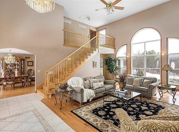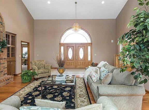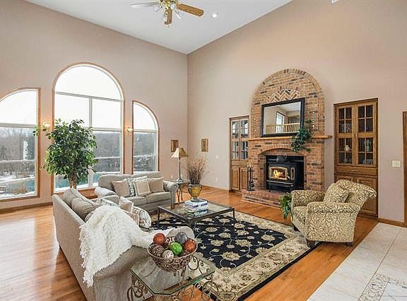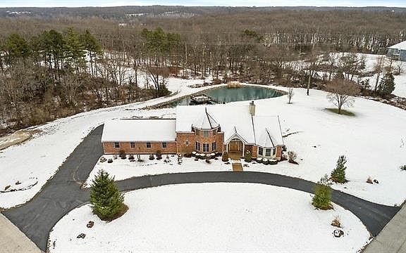 Stunning 1.5 story, 5 bedroom, 4.5 bath, over sized 4 car garage situated on 4.86 acres w/stocked pond, fountain, dock & located in Wentzville School District. 2 story great room w/vaulted ceiling, hardwood flooring, wood burning fireplace & wall of windows overlooking pond & professionally landscaped grounds. Dining rm. features hardwood flooring, bay window, kitchen w/ granite counter top & breakfast bar, tile backsplash, 5 burner gas cooktop, main floor master w/ceiling fan, bay window & Ensuite master bath. Master bath has separate shower & corner jetted tub & 2 water closets w/private toilets. Upper level bedrooms 2 & 3 have new carpeting, ceiling fans, walk in closets & Ensuite bathrooms w/ceramic tile flooring. LL features kitchenette, family room w/wood burning fireplace, ceiling fan & walk out French door to patio & bedrooms 4 & 5. Lower level office has built in desk, cabinets & features a 16x6 safe room for private storage. Seller is offering 1 year H.S.A. warranty.