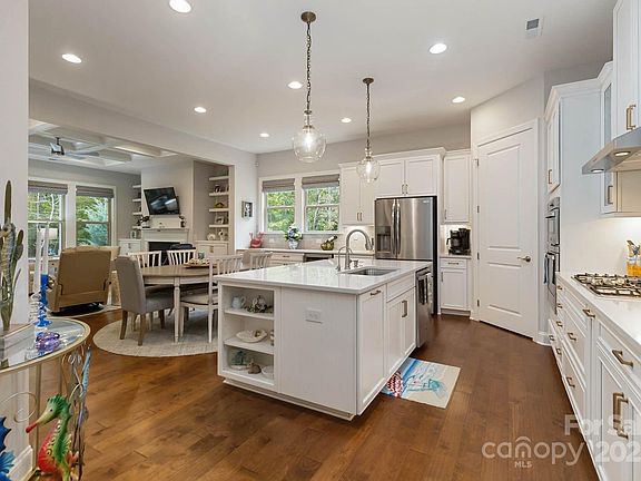 Beautifully situated on a private cul-de-sac lot, this home offers luxury, comfort, and thoughtful upgrades throughout. Enjoy hardwood floors, upgraded lighting, and elegant trim work. The all-white kitchen features quartz countertops, stone tile backsplash, stainless appliances with gas range, soft-close cabinets with pull-out shelving, wine refrigerator, and remote-controlled Roman shades. The family room boasts a coffered ceiling and gas fireplace.