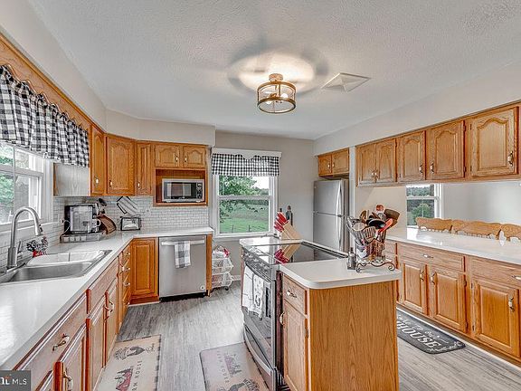 Beautifully remodeled in 2021 and enviably set on an unrestricted .82-acre lot in Hedgesville, a show-stopping list of updates has transformed this abode into a stylish haven that's sure to delight. A bright, open living room has stunning vaulted wood-beamed ceilings anchored by a full-wall stone brand new wood insert with lined chimney, surrounded with built-in shelving & new hardwood floors. Newly installed laminate vinyl flooring combines with elegant wainscoting and millwork to bring a rustic charm to the impressive interior. Brilliant sunlight spills in through multiple windows in the country-style kitchen where abundant cabinetry, stainless steel appliances, and a breakfast bar await the home cook. There's also a separate room set aside for enjoying your crafts or hobbies. Ceiling fans and new carpet add comfort in the bedrooms, all accommodated by upgraded baths with new tubs, toilets, vanities, sinks, and faucets. Explore the generous proportions of the partially fenced backyard as you host weekend cookouts or alfresco dinners. Among the many major improvements are new windows, 2 HVAC systems, 200-amp electrical service, a water treatment system with a softener, a new water heater, and a new pressure tank. As a bonus, there’s a brand new 50-year architectural shingle roof, a detached 2-car garage, and a washer/dryer. With all this remarkable residence has to offer, why just read about it? Come for a tour and let your imagination run wild with the possibilities! Only 20 minutes to commuter routes!!