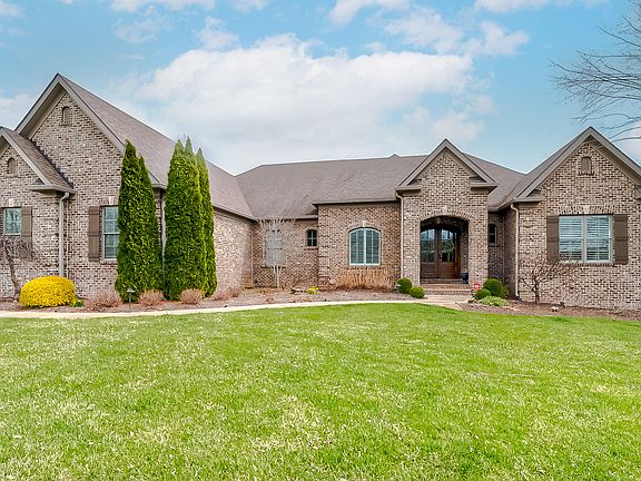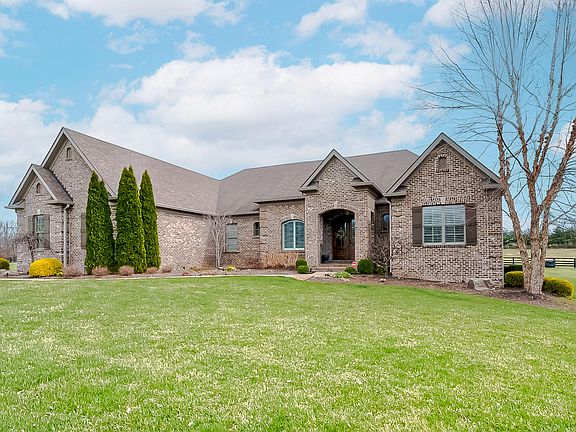 This stunning, custom built ranch in Renaissance Run is the one you have been waiting for! Sensational split bedroom ranch design sits on a 1 acre cul-de-sac lot featuring 10' and 12' ceilings, random width hardwood floors, custom built-ins and millwork, 2 fireplaces with ventless gas logs, upscale custom kitchen with large island and hidden, walk in pantry that opens to a grand great room with coffered 12' ceilings , a private study, grand owner's suite with luxurious bath and custom closet, 2 oversized quest bedrooms with ensuite baths, and a one of a kind all season room drenched in natural light. The custom vaulted rear porch with stone fireplace, and tongue n grove wood ceiling overlooking the rear farm is ideal for entertaining.