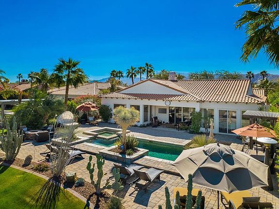 Highly Upgraded Santa Barbara Style with Amazing Outdoor Living and Views overlooking Mountains and Multiple Fairways of the Pete Dye Course at Mission Hills Country Club. Coveted Royal Saint Georges Way and Great Curb Appeal with Custom Landscaping. Enter through a dramatic tower to the courtyard with double glass entry doors. Inside is a large light and bright open Great Room with stacked stone fireplace, beamed ceilings, entertainer's bar and pocket sliders for great indoor/outdoor living. The Great Room opens to a Gourmet Social Kitchen with slab granite island and stainless appliances and a Dining area overlooking the Pool Terrace and expansive backyard. The Master Suite features a travertine filled spa bath and direct entry to the Pool Terrace. 3 Guest Bedrooms, each with an ensuite bath provide great space for family and friends or an optional den/office. Outside you will find a dream backyard - a custom paver covered terrace with expansive covered outdoor living, built-in BBQ island for dining, firepit, pool and spa all overlooking the fairways and mountains. Custom Landscaping and Lighting and extensive upgrades throughout. Low Legacy HOA includes Social/Fitness Membership to Mission Hills Country Club and Landscaping. Transitional Design and Stylishly Furnished -Furnishings Negotiable and Ready to Enjoy Now. The one you have been waiting for- come home to your own desert retreat!