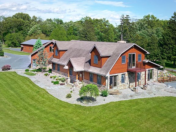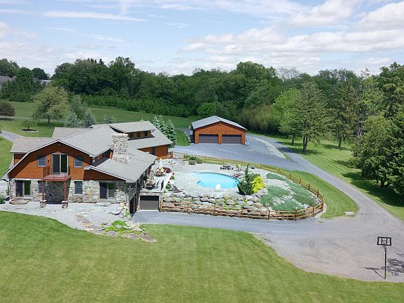Spectacular waterside retreat. 46 acres w/ 4 acre stocked pond w/ island. In-ground pool w/ stunning stonework & gardens. Professionally renovated & landscaped. 9 zone heating & radiant heat flrs. Kitchen w/ maple cabinetry, granite counter tops, SS appliances & tile flrs. Sunrm w/ stone wall & flooring. 2nd floor master suite w/ abundance of windows to enjoy pond views, T&G ceilings & balcony. Serious master bath w/ granite counters, glass & stone double shower w/ radiant heat floor, large WICs, double sinks & vanity. 3 car garage w/ 2nd level for future apartment (pending zoning approval). Roughly plumbed for bathrm. Paver terrace overlooks pool w/ access points from kitchen, den & mudrm. 40 x 60 pole barn for car buff w/ 2 heating zones & 7 bays. Enthralling property 73 miles to NYC.
