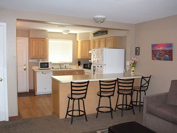 Cozy 2-bedroom apartment, fully furnished, located 2 blocks from downtown Page, AZ. Perfect for 2 roommates or a small family. It includes 1 bathroom with a tub/shower combination, private, fenced backyard with BBQ(propane). 1 queen bed and closet in each private room. Fully furnished kitchen with washer and dryer in unit. Living room has a love seat and a pull-out queen sofa bed and a smart TV. There is an electric heat pump HVAC unit for heating and cooling. No swamp cooler. 1400.00 per month. 3 person maximum occupancy. Venmo or Zelle for payment. water, electric, sewer and Wi-Fi NOT included. Wi-Fi is 65.00 per month and utilities vary according to usage, typically ranges between $60.00- $125.00 per month. $500.00 security deposit used to professionally clean carpets and apartment upon departure. Also to fix any damage that might occur. Any remaining deposit will be refunded back.