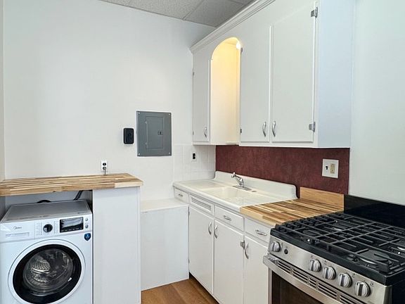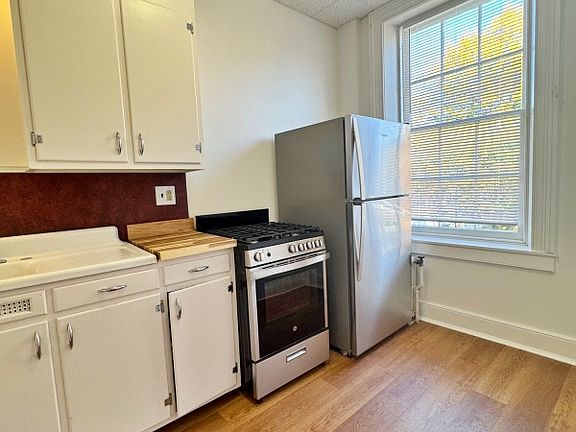 2nd floor - 1 bedroom, 1 bath apartment with wood floors throughout. Living room with built-in shelving and eat-in kitchen with stove, refrigerator and washer/dryer. 1-off street parking space included in rear of property. No pets and no smoking indoors. 1 year lease term Tenant pays electric and gas Washer/Dryer included No smoking No pets