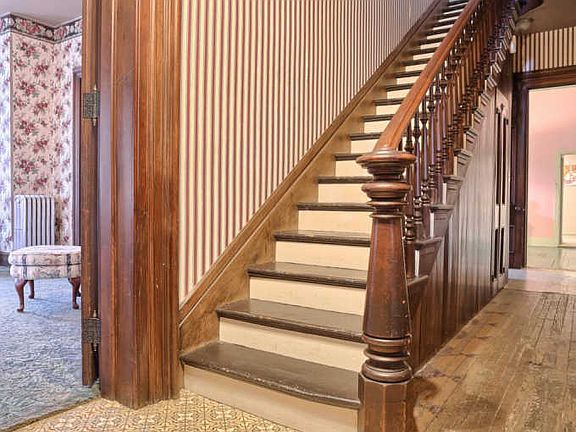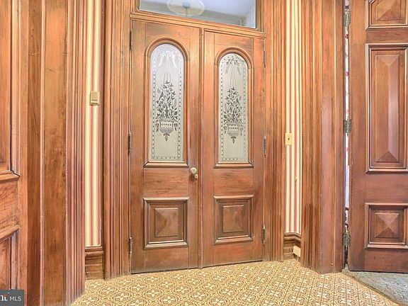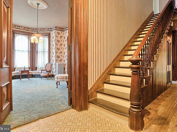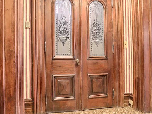 Stately 1876 3 story brownstone home features 11' ceilings on 1st & 2nd floors, original chestnut woodwork with beautiful architectural detail, wood floors, wood shutters built into each window, original hardware on many doors, updated kitchen, 2 car garage, whole house generator, new multi-fuel heating system (currently propane, can be converted to oil) and so much more. You must see this home to appreciate it's rare beauty. So many rooms the possibilities are endless! Possible Bed & Breakfast ( B&B ), apartments, home based business, church, etc.