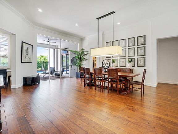 Triple Mint, Highly Desirable Single Level Rosello Model Home Located on a Cul-De-Sac Street. Sun-Lite 4Bed/2.5 Bath Pool Home has a Separate Den, Family, Living & Dining Rooms. Modern Open Kitchen Includes; Quartz Counters, Marble Tile Backsplash, Top Notch Appliances, Breakfast Island & Dinette Area. Panoramic Windows & Doors Provide Patio & Pool Views. Huge Primary Bedroom has His/Hers Shelved Closets, Large 2nd/3rd/4th Bedrooms. Interior & Exterior Features Includes; Plank Wood Floors, Crown Molding, Coffered Ceilings, Plantation Window Treatments, Accordion Hurricane Shutters, House Generator, Fenced-In Back Yard & Extended Paver Patio/Lanai. New AC & Hot Water Heater. Mirabella has Fabulous Resort-Like Amenities, Minutes to the Beach, Restaurants, Shops & Airport, ''A'' Rated Schools