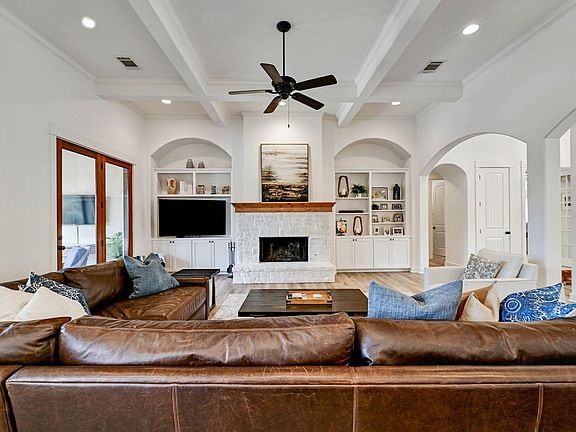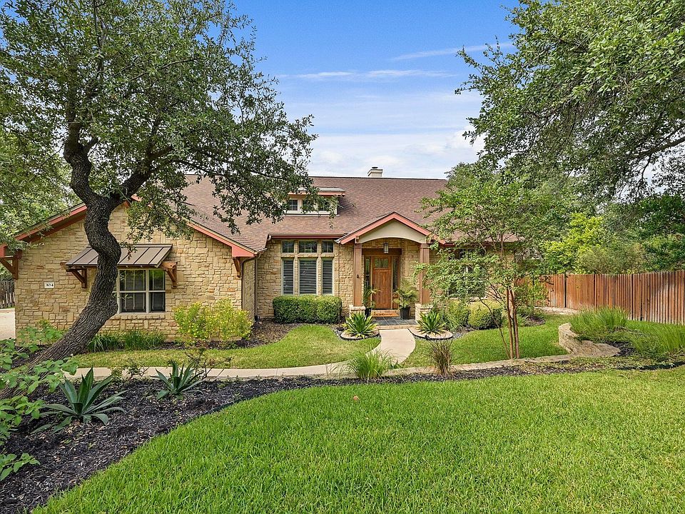 This inviting Lakeway home offers 4 bedrooms and 4.5 baths in a layout that lives like a single story, with all bedrooms on the main level. High ceilings, plantation shutters, crown molding, and a stone fireplace create warmth and character throughout the open living spaces. The kitchen features granite counters, an island, walk-in pantry, and abundant cabinetry, flowing easily into the breakfast nook and family room. The spacious primary suite includes a custom walk-in closet and a spa-style bath with jetted tub and walk-in shower. A private office with French doors and an upstairs bonus room with half bath provide versatile space for work, play, or guests. Step outside to a backyard retreat with a sparkling pool and waterfall, pergola, covered and screened porches, and mature landscaping. The side-entry garage offers additional storage and workshop space, while a new roof (2023) adds peace of mind. Located in highly rated Lake Travis ISD, this home is minutes from The Hills Country Club, World of Tennis, Yaupon Golf Course, Lakeway City Park, and scenic hike and bike trails. A blend of comfort, function, and resort-style living in the heart of Lakeway.