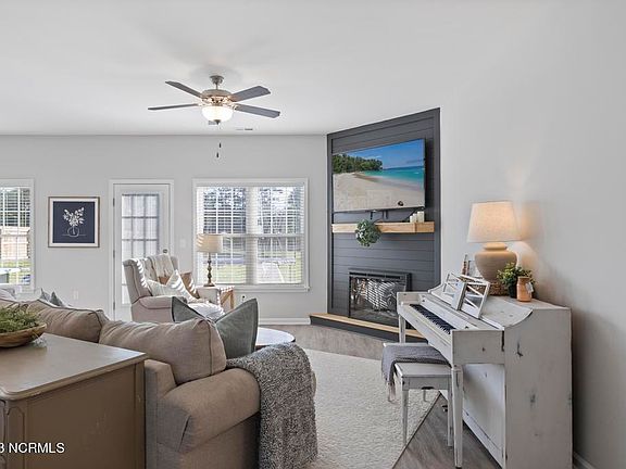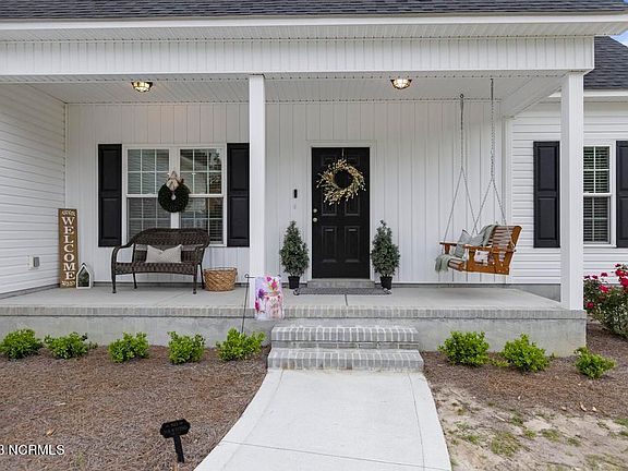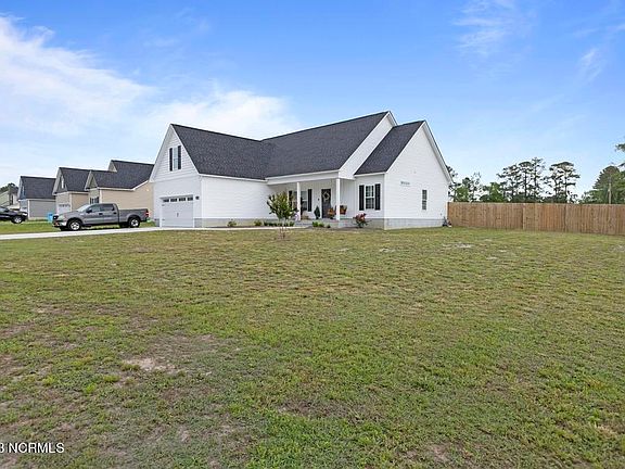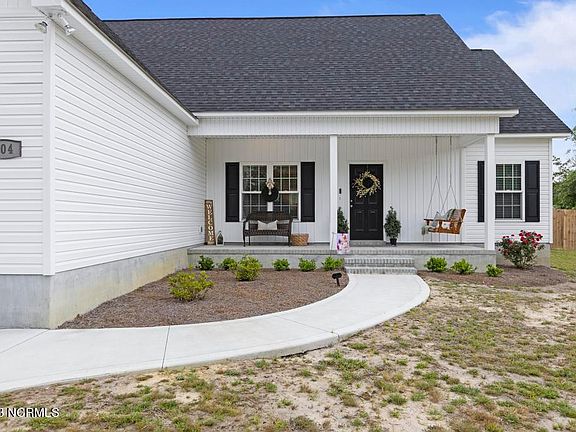 This home has 3 Bedrooms with a Bonus and screams Modern Farmhouse! This practically brand new home has all the perks of a new construction and the benefits of a resale! The homeowners have added several touches to make the home unique! Once you arrive at 104 Scott Jenkins Road you will notice that the home is located on a corner lot and has 2 access points with an additional driveway for extra parking. The home has traditional black and white exterior colors with board and batten accent. The home has a southern style covered front porch that is large enough for a porch swing. The floor plan has open living areas, a separate dining area and a split bedroom setup. The living areas have barn wood style LVP flooring for easy maintenance, neutral paint color and tons of natural light. The electric fireplace is a standout feature in the living room with shiplap and wood accents. The kitchen has beautiful two-tone cabinets, a working island providing additional seating and workspace, a pantry and access to the backyard. The Master Suite features a trey ceiling, is large enough for a king size bed, lots of natural light, dual vanity sinks and a spacious walk-in closet that even has a window. The other two bedrooms are good sized, have spacious closets, neutral paint and share the cutest bathroom that has been upgraded from builder grade to modern farmhouse. The Finished Bonus Room provides additional space that can serve multiple purposes. The laundry room is conveniently located off the garage and has shelving. The home comes complete with upgraded light fixtures, plantation style blinds, a wood privacy fence, patio and additional landscaping has been added. If you are looking for a New Construction home and wanting all the Extras-this is it! Property has a convenient location to the area's bases and beach! Make your appointment today!