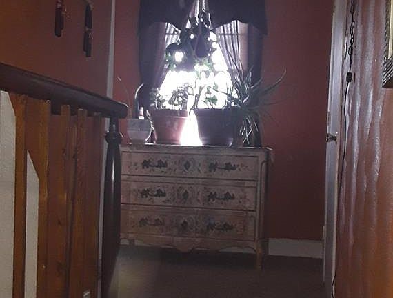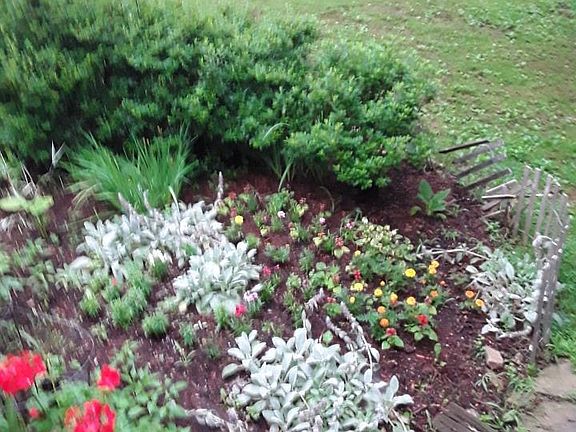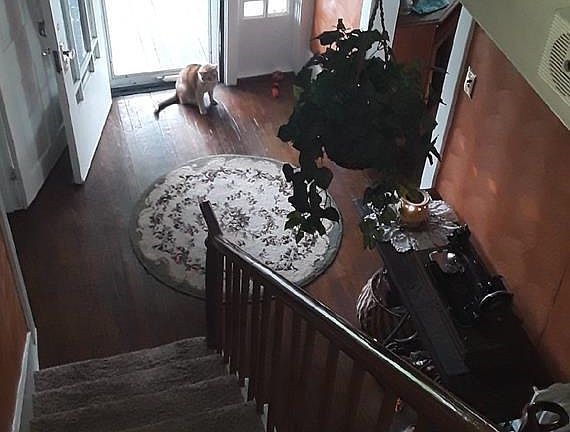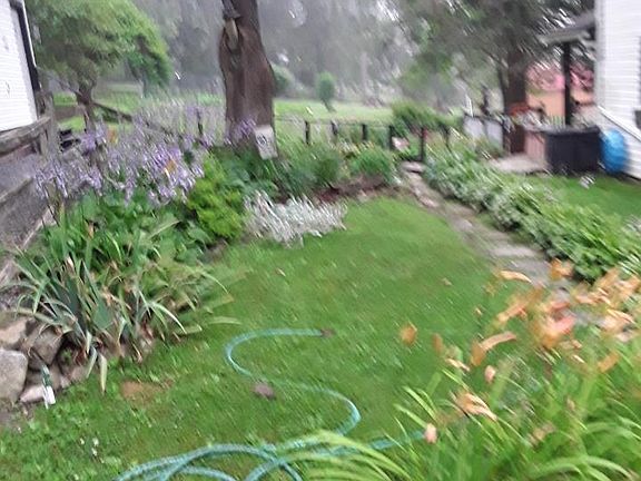 Classic farmhouse with gentle sloping yard, country style kitchen, open staircase and a large detached garage.