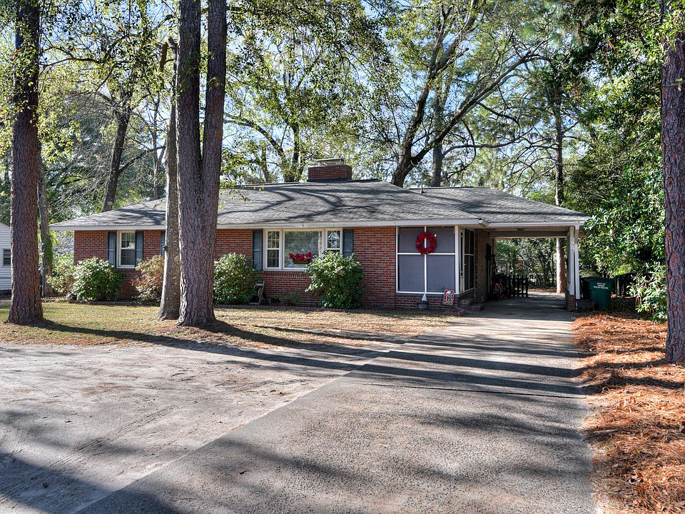 Charming, recently renovated one level brick home in Aiken Estates close to shopping, dining, and Hitchcock Woods! The 3-bedroom house has wood and laminate floors, living room with working wood burning fireplace and renovated kitchen with new Corian counters (2022), SS appliances, custom cabinetry, Subway tile backsplash, dining room, lovely screened-in porch, and carport. The home sits back from the road and the large backyard is partially fenced and private with nice hardwood trees. New bathroom, plumbing, wiring, new insulated windows and interior doors replaced in 2019 and new roof in 2021. This would make a wonderful starter home or investment opportunity with a fabulous location on Aiken's Southside close to shops, restaurants, grocery stores, Odell Weeks recreational park and the entrance to Hitchcock Woods with miles of hiking trails. 7 minutes from downtown Aiken.