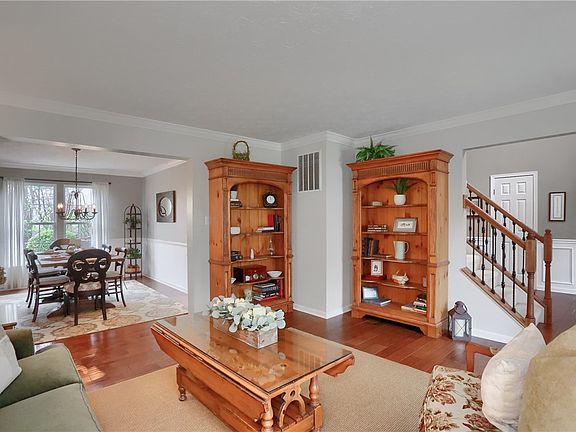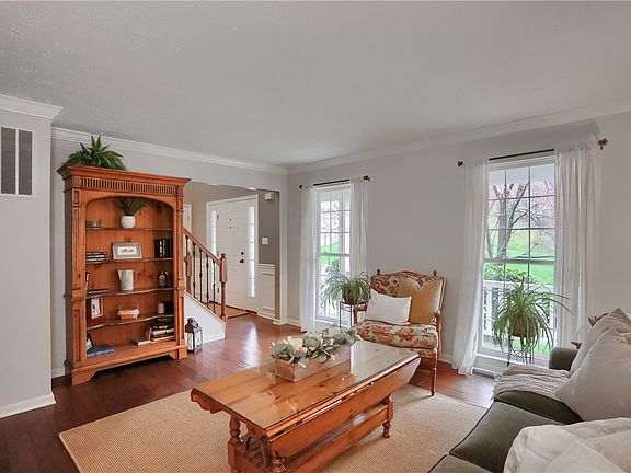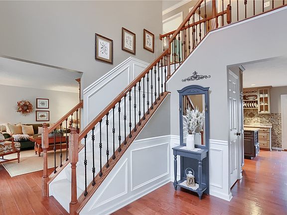 Nestled in the sought-after Village of Adams Ridge, this beautifully updated home offers access to top-tier amenities, including a clubhouse, pool, playgrounds, and various sports courts—all within a walkable community. Situated on a cul-de-sac with a private, partially wooded flat backyard, it features a rear deck with an awning for outdoor enjoyment. Inside, the English country-style kitchen boasts custom solid oak cabinetry and granite countertops. The first floor showcases luxury scraped hickory hardwood floors and refined lighting throughout. A grand two-story entryway leads to four spacious bedrooms, including a master suite with a walk-in closet, soaking tub, separate shower, and double-sink vanity. The finished walk-out basement includes a home office and bonus storage. With two full baths upstairs, a half bath on the main level, and a two-car attached garage, this home seamlessly blends comfort and convenience.