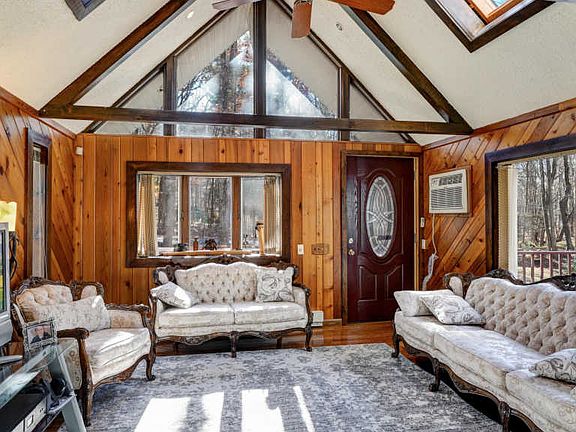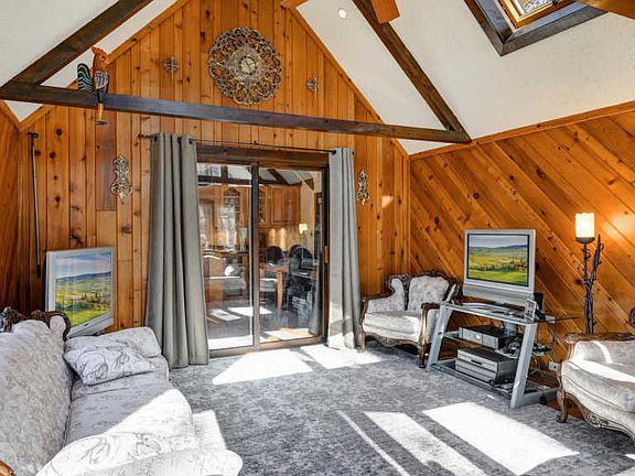 LODGE LIKE INTERIOR! UPDATED KITCHEN! CORNER LOT! Look no further than this 2 bedroom (plus bonus room), 2 full bath, turn key home with CATHEDRAL CEILING, TRUSSES, & A MAGICAL WARMTH FROM KNOTTY PINE WALLS! This contemporary home situated on .40 acres, offers the best of outdoor (gardens, deck, & covered patio) & indoor living! A spacious, GRANITE & STAINLESS STEEL KITCHEN! Tons of custom cabinets and workspace w/views of your glorious 2 story great room! Hardwood floors, large family/living rooms, a stunning brick-faced fireplace, & updated, bathrooms! Master ensuite upstairs features high, angled ceilings, granite coffee/wine bar, walk-in closet, & an amazing 2 story bath w/granite counters, tiled shower, jacuzzi, & views! New well! New heating & A/C ductless units w/ wifi!