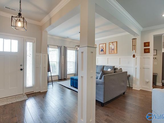 Excellent location in Madison City Schools! This stunning home offers a foyer and wainscoted dining room that flow into a spacious living area with hardwood floors, crown molding, and a gas fireplace. The kitchen features a gas cooktop, stainless steel appliances, granite countertops, tile backsplash, recessed lighting, and a large island. The private master suite includes double granite vanities, a tiled shower with bench, frameless glass door, garden tub, and walk-in closet. With 4 bedrooms, 3 full baths, covered porches, a 3-car garage, and over 1/3 acre with irrigation—plus a peaceful, wooded backyard oasis.
