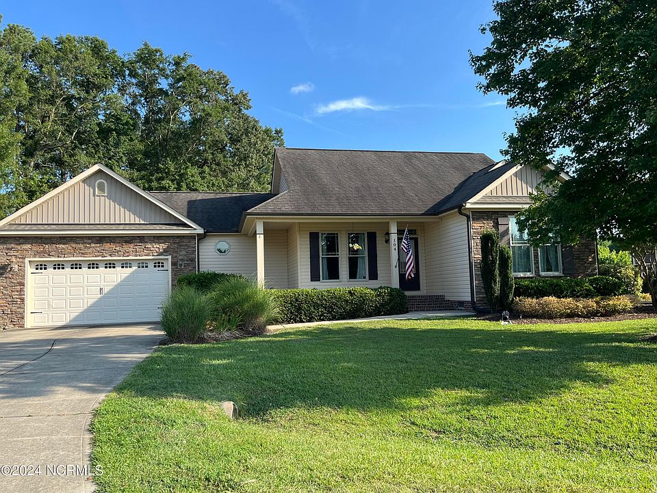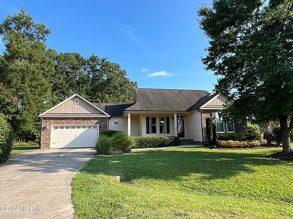 Lovely 3 bedroom 2-bathroom home located on a quiet Cul-de-sac. New paint throughout. Hardwood floors flow through foyer, living/dining room & kitchen. Spacious family room includes a stone fireplace with an open concept kitchen. Kitchen includes great cabinetry & countertop space; SS Appliances included with purchase. Off the kitchen accesses back deck-great for entertaining., This home includes a laundry room, owners' suite with walk-in closet & its own en suite bathroom with dual vanities. The 2 additional bedrooms are spacious with great closet space. This home has a double car attached garage, not to mention a FULLY FENCED BACKYARD. Located with easy access to Seymour Johnson AFB & 795. Get this one before it's gone! Assumable VA loan at 3.25%