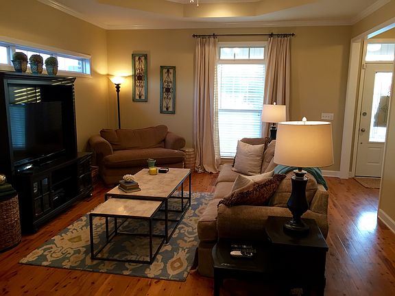Brick home with curb appeal in the desirable Sweetwater Subdivision! Enter to attractive cypress hardwood floors that flow into the grand room with trey ceiling, transom windows, crown molding and gas fireplace, then to tiled dining room and kitchen. Spacious master suite with walk-in closets, large tiled shower, separate jacuzzi tub, and vanity with double sinks. Backyard with covered patio enclosed with 6' wood privacy fence (garage inside fence) and separate black vinyl fenced area for pets!