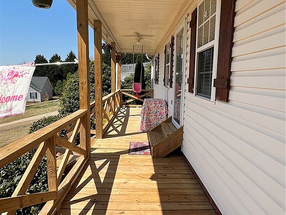 Look at this front porch!!! Welcome to this charming 3 bedroom/2 bath home with the most amazing, rocking chair front porch and pretty view. Imagine spending perfect evenings relaxing on this porch with a glass of tea. As you enter this home you will love the open floor plan. The living room features a vaulted ceiling and free-standing fireplace. It flows easily to the dining room and kitchen with white cabinets and eat-at bar. The large primary suite also boasts a vaulted ceiling, as well as a walk-in closet and private bathroom. The second bedroom is oversized and features a walk in closet. The third bedroom is nice-size and also features a walk in closet. Closet space will not be an issue with this home! The back yard offers a nice new deck for outdoor entertaining. This home has many nice updates, including a new roof in 2023, water heater in 2022, HVAC in 2022 and new decks in 2024, and is situated on a corner lot of a cul-de-sac! The only thing missing from this wonderful move in ready home is YOU!