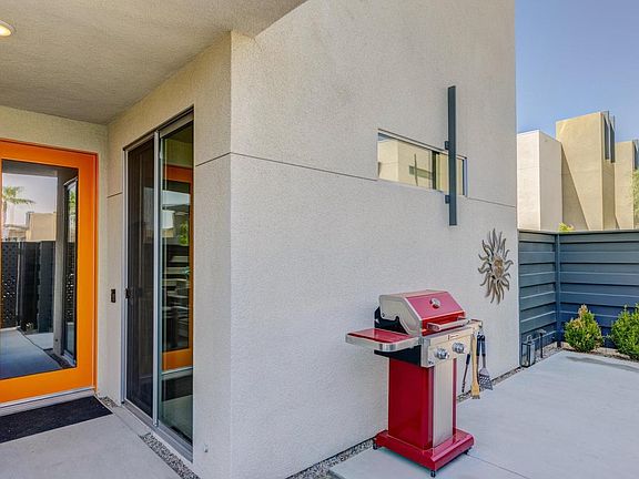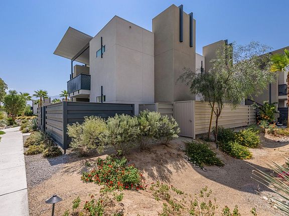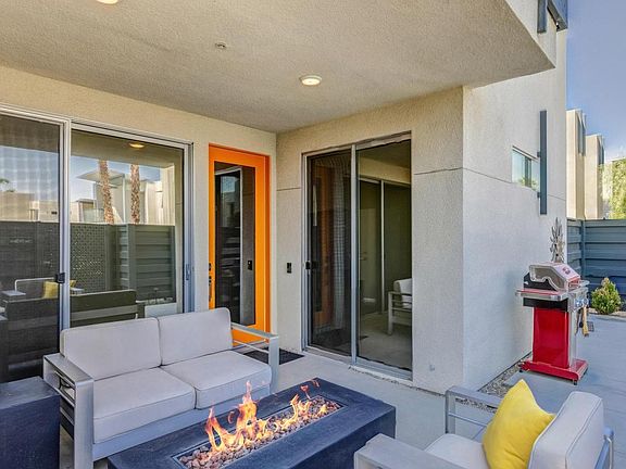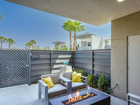 Fully furnished, move in ready. Live the resort lifestyle at this modern new construction condo within 64@TheRiv, a gated community in the Uptown Design District of Palm Springs. Lower level 2 bed + 2.5 bath condo with a premier location directly facing the pool. Two private patios and a large open floorpan with kitchen, living and dining flowing right to the covered outdoor patio space. 9' ceilings with exposed beam, 8' tall sliders onto patios, clerestory windows, quartz countertops and custom cabinetry. Fully furnished. Move in ready.