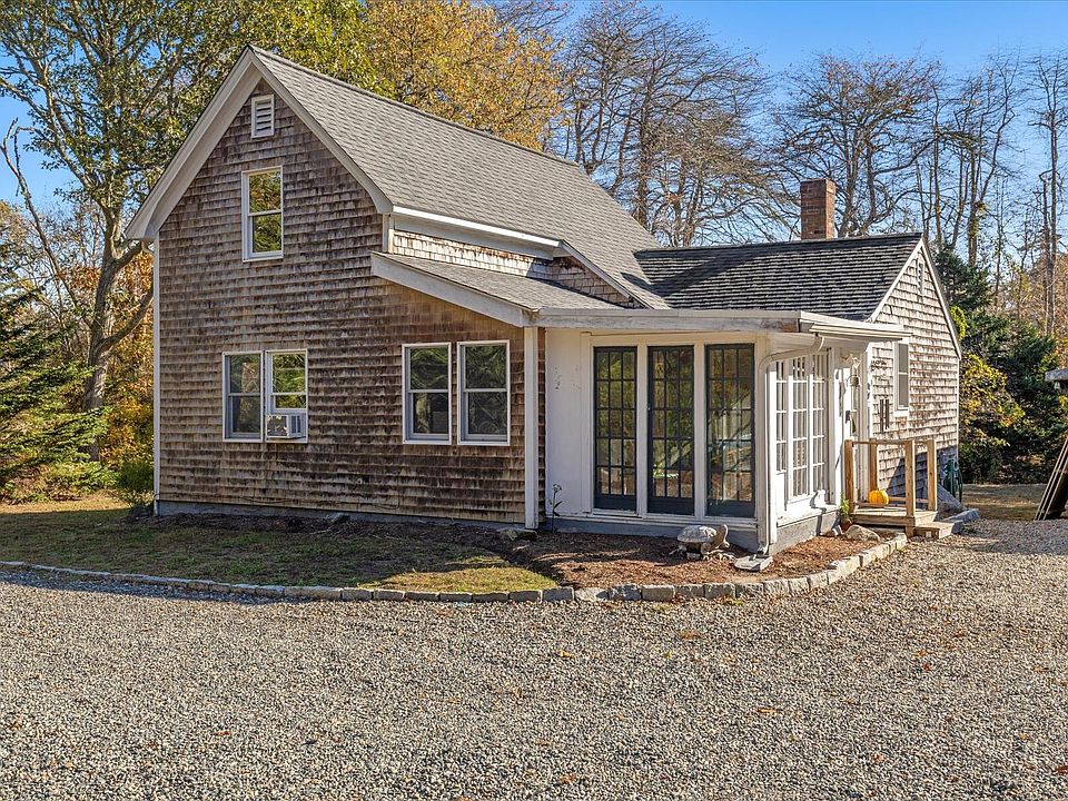Discover a classic Cape Cod retreat set on a peaceful, wooded lot offering exceptional privacy and room to spread out. This warm and welcoming home features sunny living spaces, hardwood floors, charming built-ins, and an inviting enclosed porch perfect for morning coffee. The kitchen offers great natural light and functional workspace, flowing into a comfortable dining and living area anchored by a cozy fireplace. Upstairs, two character-filled bedrooms with exposed beams create a restful getaway. Outside, the property includes multiple outbuildings ideal for storage, hobbies, or future creative use. Surrounded by mature trees and nature trails, this property offers a rare blend of serenity and convenience--just minutes to ponds, beaches, and local amenities. A wonderful opportunity to make your Cape Cod dream your own.