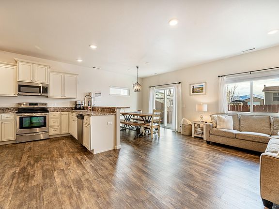Maintenance-free and affordable townhome ideally located within walking distance of TR Elementary and Middle School. Spacious home offers 3 bedrooms, 2.5 bathrooms, and attached single-car garage. Ample cupboard space and two pantries. Open-concept main level with LVP flooring throughout. Plenty of room for a dining table and large sectional. Convenient half bath completes main level. Patio doors lead to enclosed area, keeping pets and children safe. Upstairs you'll find all bedrooms, laundry and full bathrooms. Primary bedroom accommodates king-size bed and includes a private ensuite. Versatile flex space can be used as a home office, craft room, or fitness area. Enjoy mountain views from additional bedrooms and dining area. Move-in ready - equipped with everything a new homeowner needs.