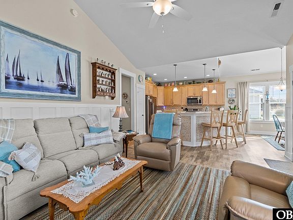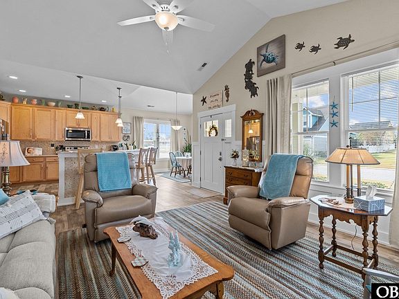 This stunning single-level home, the Jenson III model, is located in the desirable Waterside Villages community. Boasting an open floorplan with a spacious great room featuring vaulted ceilings, this 3-bedroom, 2-bathroom home offers a large kitchen with a breakfast nook and 9-foot ceilings throughout. The master suite includes a walk-in closet with additional shelving and a dual-sink bath for added convenience. The third bedroom is currently used as a sun room, but could also be a great office! The attached one-car garage is immaculate, featuring insulation and insulated garage door, a painted and sealed floor, and ample cabinetry for storage. The home is further enhanced with two electric fireplaces and charming board-and-batten accents in the living room and bathrooms. Step outside to enjoy beautiful landscaping surrounding the home, two inviting patios, porch swings, an outdoor shower, and a convenient trash can enclosure. Residents of Waterside Villages enjoy access to exceptional amenities, including a clubhouse, swimming pool, tennis courts, basketball court, boat dock with sound access, community pier, and picnic pavilion. Located just 12 miles from the OBX beaches, this home is also near three public golf courses and only minutes from local shopping and restaurants. With its peaceful setting and proximity to a wealth of amenities, this property offers the ideal blend of comfort and convenience.