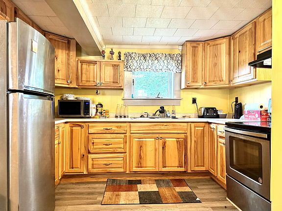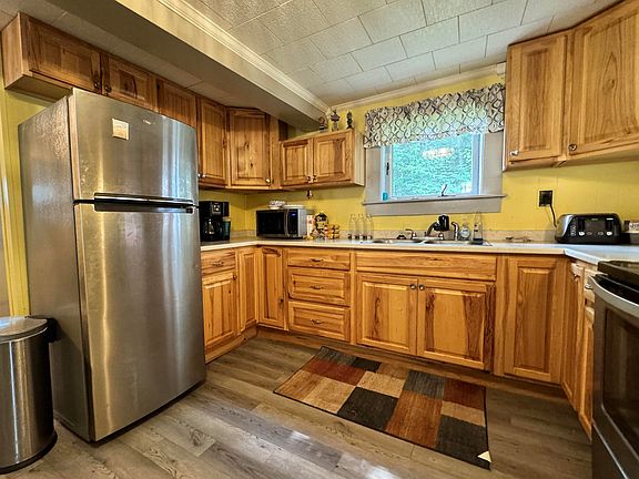 This 2 Bedroom, 2 Bath home is sited on .28 acre in the town of Whitefield NH.  The first floor has been completely renovated.  The kitchen boasts new cabinetry and countertops.  The stainless-steel range and refrigerator are included! There's a separate dining area, too. The spacious living room has knotty pine walls and is large enough to have an office nook!  The half bath is new.  The entire first level has new flooring.  The 2nd floor has 2 bedrooms.  The primary bedroom includes a separate dressing room.  It also has direct entry to a full bathroom.  There is a combination of carpet and hardwood on this level.  Enjoy the covered front porch!   It would not take much to make it a convenient mud room!  There is ample parking on this in-town lot. The yard reaches back 125 feet on both sides, so the yard could be expanded!  The metal roof and aluminum siding are nearly maintenance free.  This home is within walking distance to the Elementary School, shopping and other local amenities.