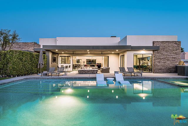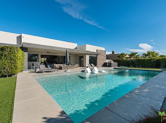 Be prepared to be impressed by this absolutely stunning modern home with spectacular views! No detail has been left unattended from the moment you enter the gated property. The home captures both light and views as a result of its volume ceilings and wide expanses of sliding glass walls. The open living/dining area is further extended by the large covered patio with a fire feature, while the large bar indoors is where all will gather. The kitchen is not only a cook's paradise, but also another area to congregate for friends and family, with it's pristine white island and top of the line appliances. The home features 4 en suite bedrooms, crowned by the enormous primary suite with its sybaritic bath. Three additional large suites plus a powder room make this the perfect home for all the times of your life. Outdoors showcases one of the largest pools we've seen along with a spa and multiple areas for sunbathing, dining and seating. Finally, there is a 3-car garage with finished interior